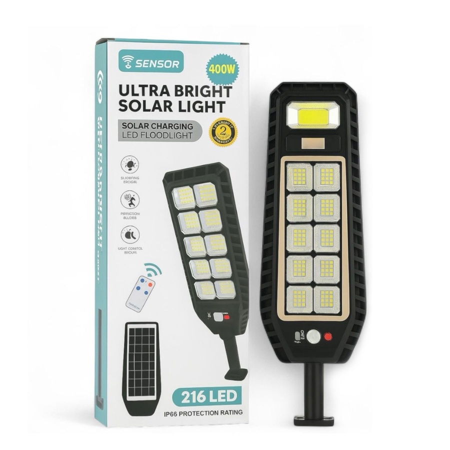 كشاف طاقة شمسية 400 واط مزود بـ 216 لمبة LED، حساس حركة، ريموت تحكم، يعمل تلقائيًا ليلًا، مقاوم للماء IP65، مناسب للحدائق والمداخل ويوفر الكهرباء بالكامل.