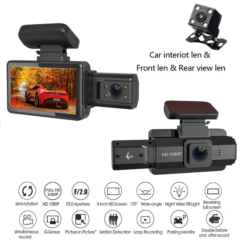 -شاشة قياس 3 بوصات وبكسل 1920 1080P للعدسة الأمامية و720 480P للداخلية والخلفية
