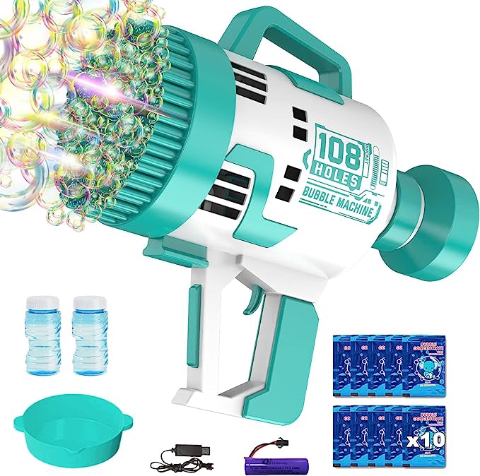 جرب مسدس صنع الفقاعات، 108فتحة يقوم هذا المنتج بإطلاق الفقاعات الجميلة في الهواء ويحتوي على إضاءة متعددة الألوان تجعل الفقاعات تبدو وكأنها تتلألأ في الليل.