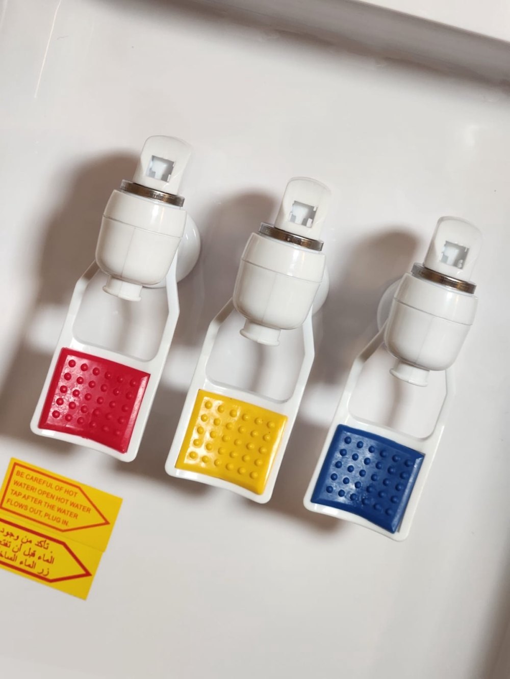 ▪️كل زر يحتوي على لون ، إما أزرق أو أصفر أو أحمر ، ليسهل عليك معرفة درجة حرارة المياه التي سوف تحصل عليها ، حيث أن اللون الأحمر يدل على المياه الحاره ، واللون الأصفر للمياه المتوسطة ، والأزرق للمياه الباردة.