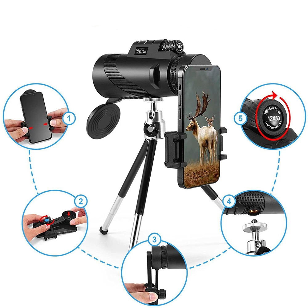 يأتي تلسكوب أحادي العدسة عالي الدقة مع أحدث حامل للجوال وحامل ثلاثي عالي الجودة.