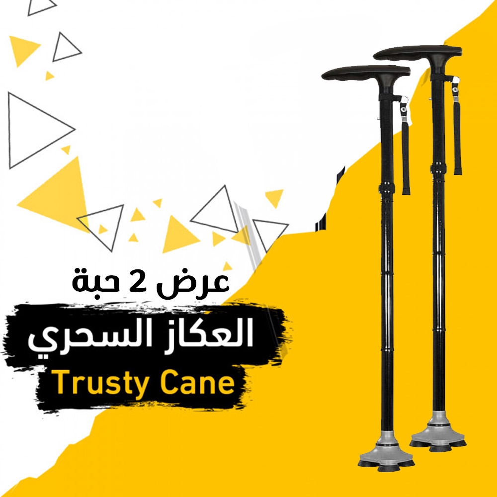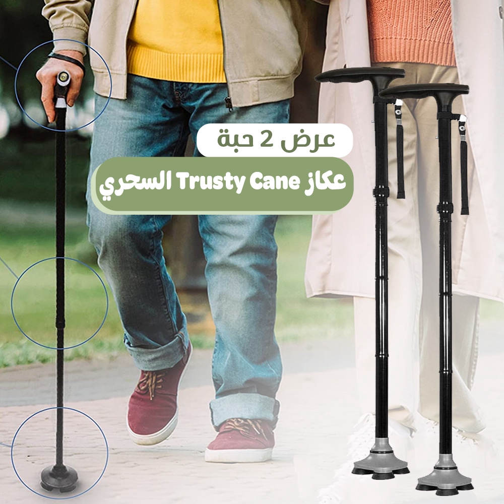 العكاز السحري Trusty Cane ، مزود بقاعدة متحركة ليها اربع أرجل من الكاوتش المقوى المانع للإنزلاق، تصميم اليد بخمس مستويات من الطول لتناسب كل الأشخاص.