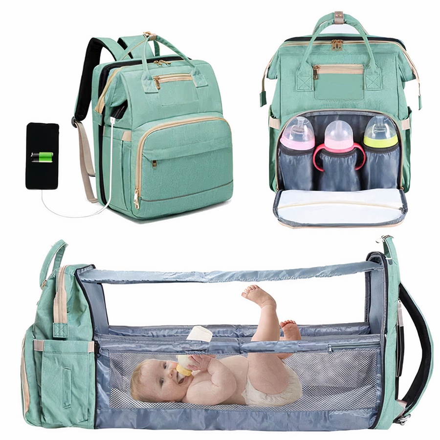 حقيبة حفاضات الأطفال المحمولة، قابلة للطي ومنفذ شحن USB.