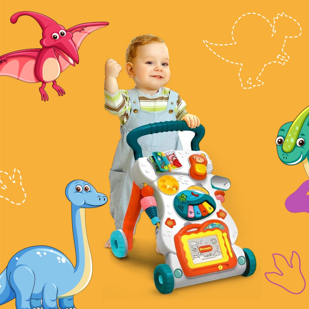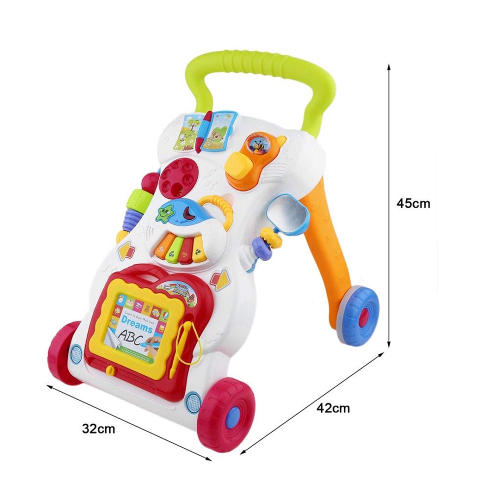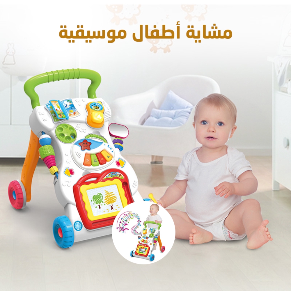 عربة تعليم المشي 4 في 1 للاطفال الصغار، لوح رسم وجهاز موسيقى وهاتف صغير