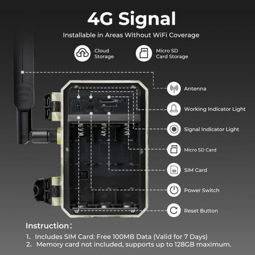 【شبكة خلوية 4G، شاهد الكاميرا الخاصة بك في أي وقت ومن أي مكان】 تعتمد الكاميرا على شبكة 4G/LTE الخلوية وتُتحكم بها عبر تطبيق، مما يسمح لك بالتحكم في الكاميرا عن بُعد في أي وقت ومن أي مكان.