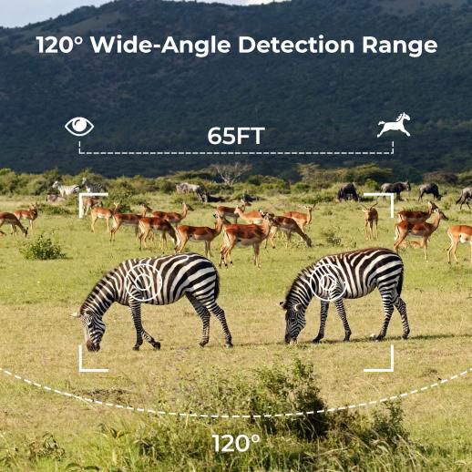 【مستشعر الأشعة تحت الحمراء السلبي عاليالحساسية】 يمكن للكاميرا التقاط كل لحظة مثيرة، ويصل نطاق الكشف إلى 95 درجة، ومسافة الكشف تصل إلى 50 قدمًا/15 مترًا؛ مزودة بـ 8 مصابيح LED بقوة 940 نانومتر تمكنك من تسجيل مقاطع الفيديو والصور المدهشة دون إزعاج أو إخافة هدف الصيد.