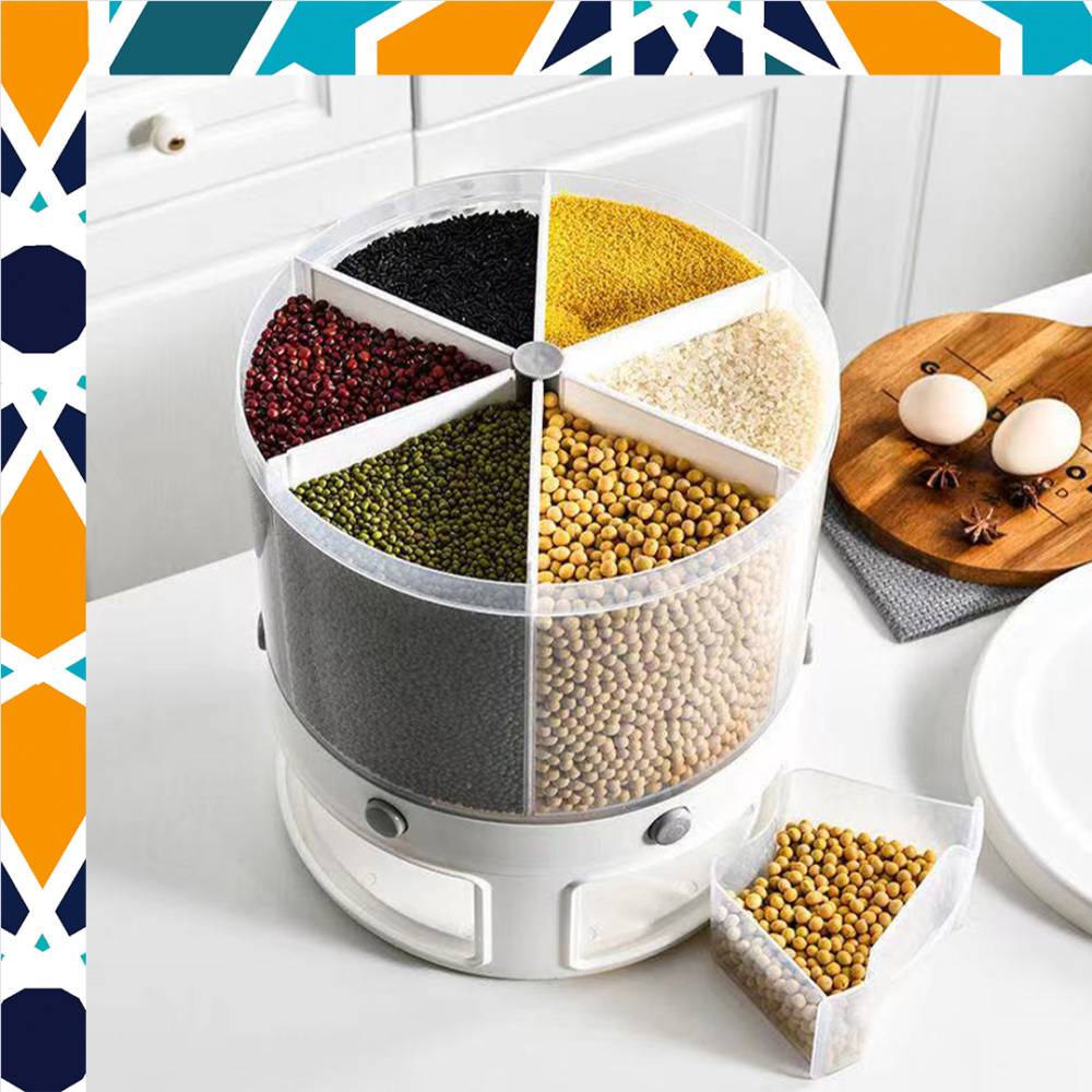 إضافة عملية لمستلزمات مطبخكِ العصري تتمثل في هذا الموزع المثالي لتخزين ستة أنواع من الحبوب في تصميمه المقسم.