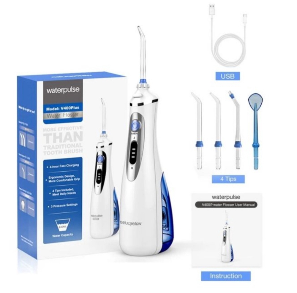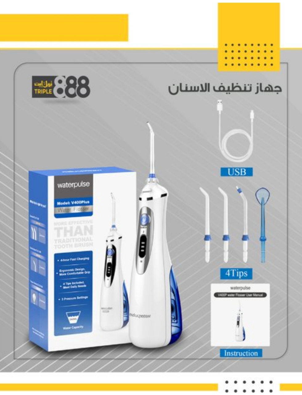 - يحتوي هذا المنتج على 4 رؤوس مختلفة (2 لجميع الاستخدامات - رأس خاص لتنظيف تقويم الأسنان و التركيبات - رأس خاص لتنظيف اللسان )